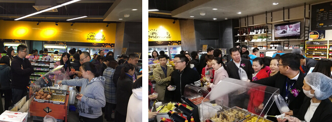 除了常規的商品陳列區和收銀區之外,萬麥便利店內還設計了環形冷鮮區、自助熟食區、面包制作區、促銷堆頭區,區域設計十分獨特,開啟了便利店經營的新模式。