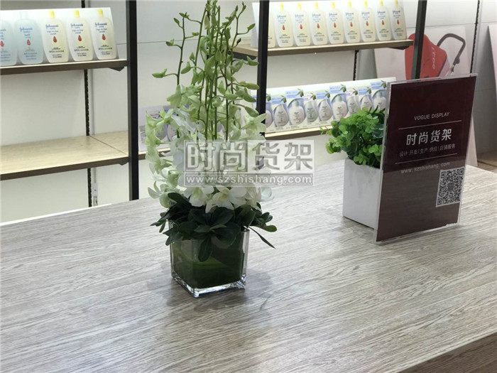 整個設計均采用時尚貨架設計生產的【母嬰店貨架系列】,包括中島貨架,單面貨架,時尚吧臺座椅,定制促銷展臺,房型創意展架等。