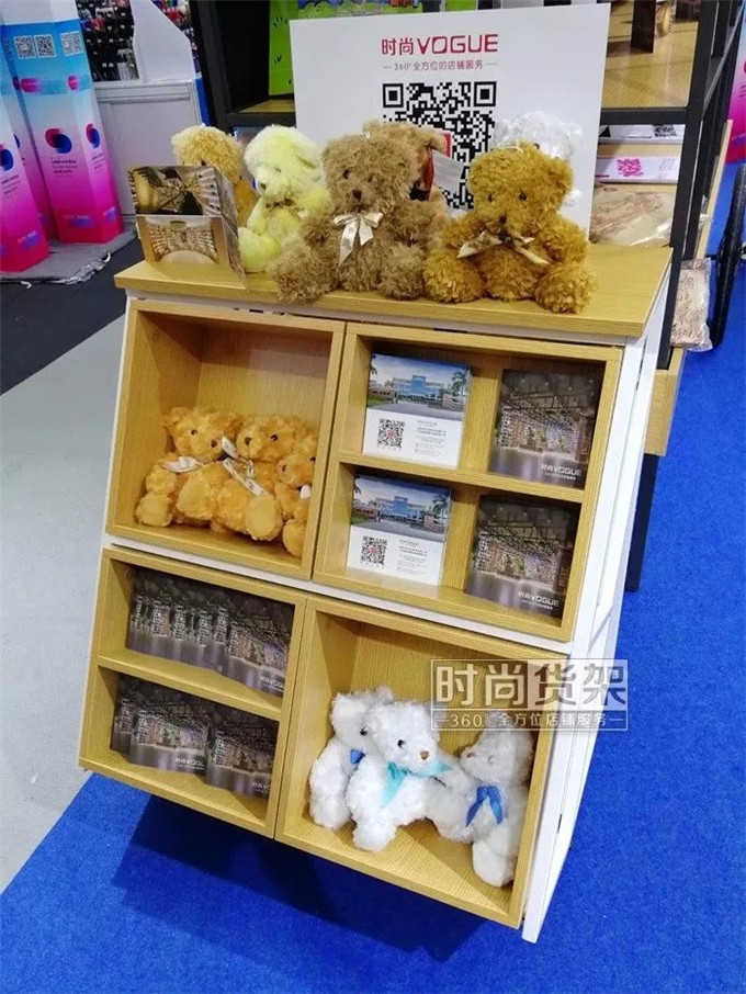 在展架前端傾斜設置一組小方柜,不僅增加了商品陳列的面積,更方便身高不夠的小朋友拿取,一舉兩得。