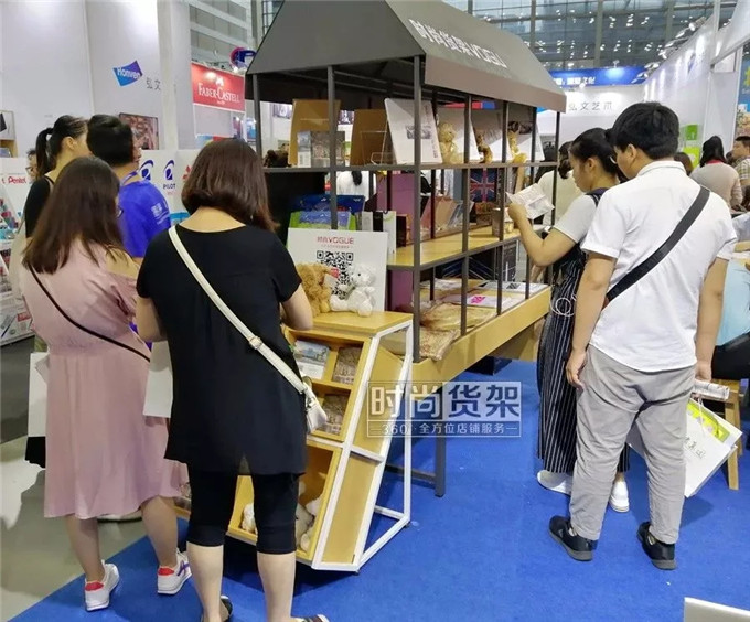 剛過10點,展會就熱鬧了起來,【2B004展位】上展出的書架正是時尚貨架,精美的書架吸引了許多參展觀眾的目光,在眾多書籍和文具展品中脫穎而出。