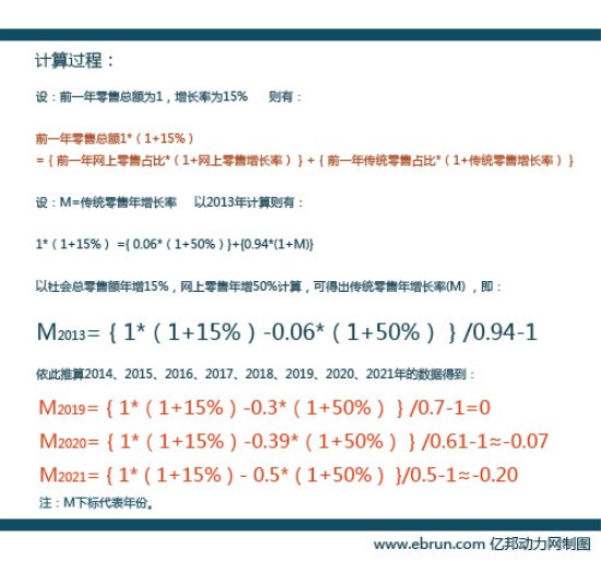 參考網上零售50%的平均年增幅,可以推算傳統線下零售的年增長率。計算模型如下: