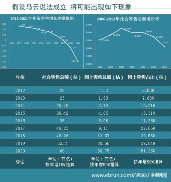 如果2020年網上零售占比達到50%,傳統零售將在2019年出現負增長,而在2020年甚至會出現13%的負增長。面對這樣幾乎不可能實現的目標,馬云的信心可還在?