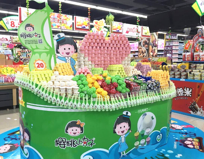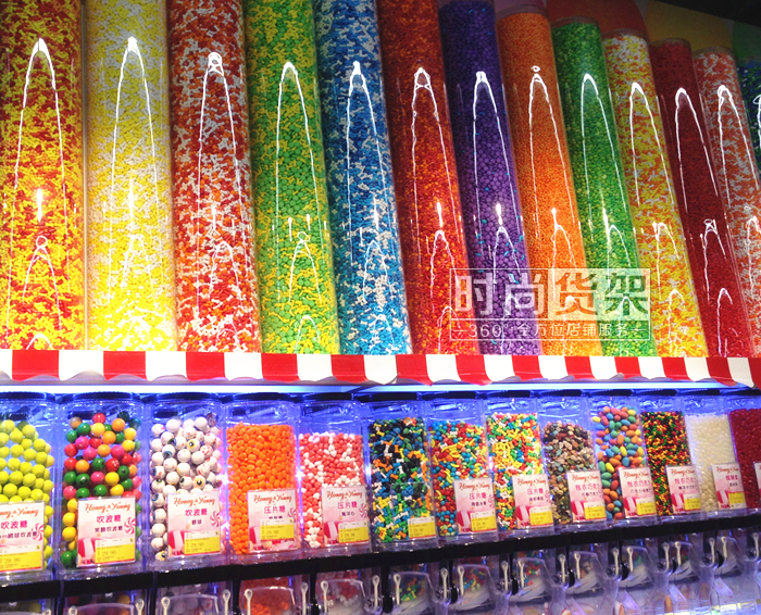 將散裝零食以不同的色彩或造型陳列,彰顯個性化形象,打破超市散裝區的沉悶和死板,更顯活潑。