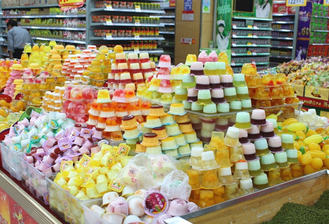 類似果凍這樣的硬包裝類散裝零食可以采用逐層遞增的方式陳列,俗稱步步高陳列。這樣陳列的好處是讓商品展示效果更有層次,美觀性更強。