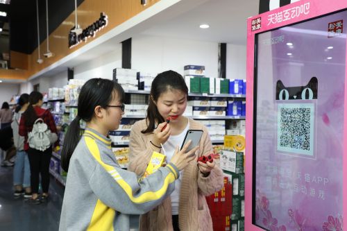 在這所男女比例3:7的高校,女大學(xué)生成為了絕對(duì)的消費(fèi)主力軍。天貓互動(dòng)吧派樣機(jī)、天貓魔鏡擠滿了女大學(xué)生,按照界面的指引進(jìn)行操作體驗(yàn),試口紅。