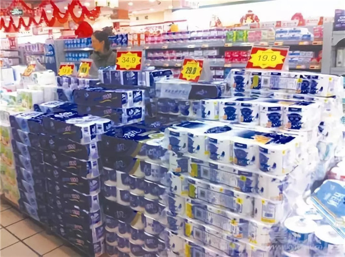 層疊堆積陳列法:像圖中的衛生紙等大型生活日用品,擁有穩定的結構,就可以直接堆積陳列在超市中央,讓它們看上去更加實惠便宜。