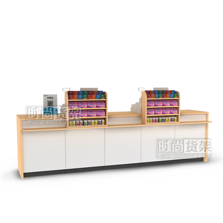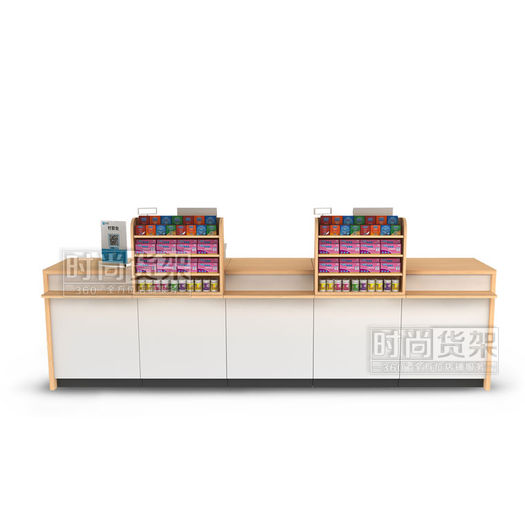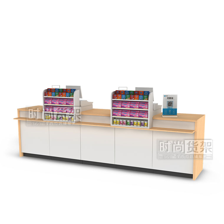【描述】采用了經典的鋼木結構,優質的冷軋鋼柜身,和高密度環保木板,讓收銀臺結構穩固,承重能力升級。收銀臺的臺面使用原木木紋,具有櫻桃木和白橡木兩種顏色可供選擇,與白色的柜身搭配起來十分高檔、精美!同時可以選配小前架和置物板,瞬間提升店鋪形象,增加收銀區陳列空間。