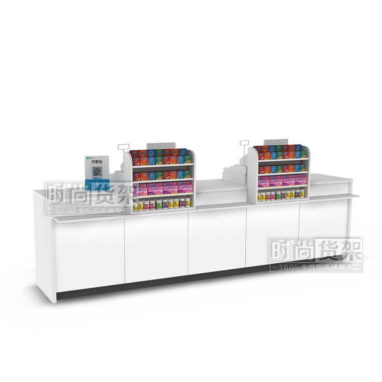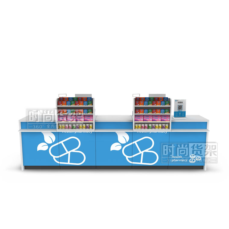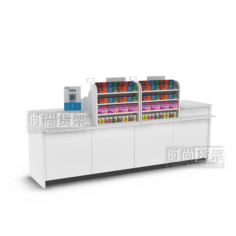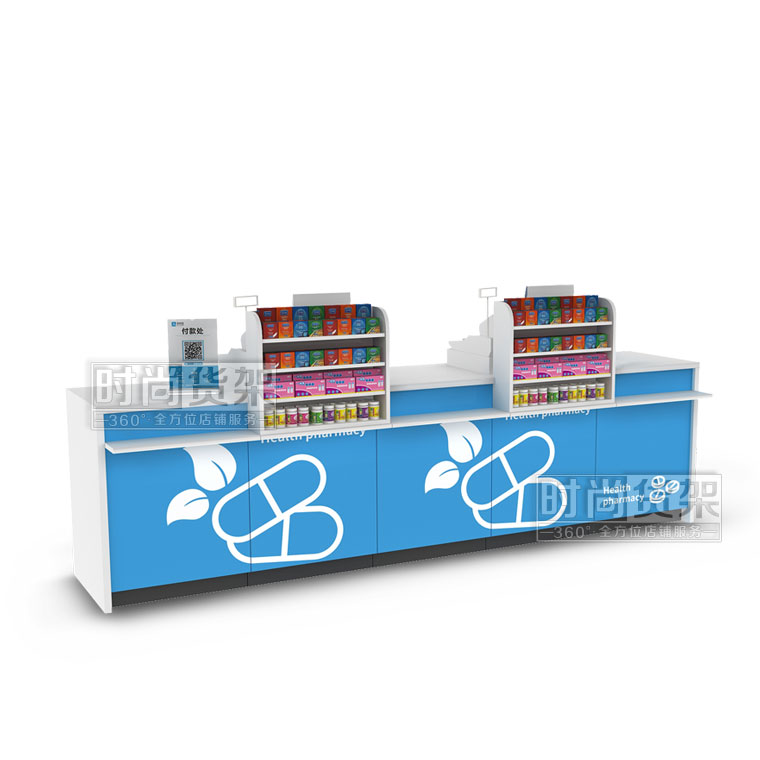 這是藥店貨架廠家【時尚貨架】最新打造的一款藥店收銀臺,如果你想了解其他的藥店貨架產品,請點擊m.nb-hs.com/pharmacy/。