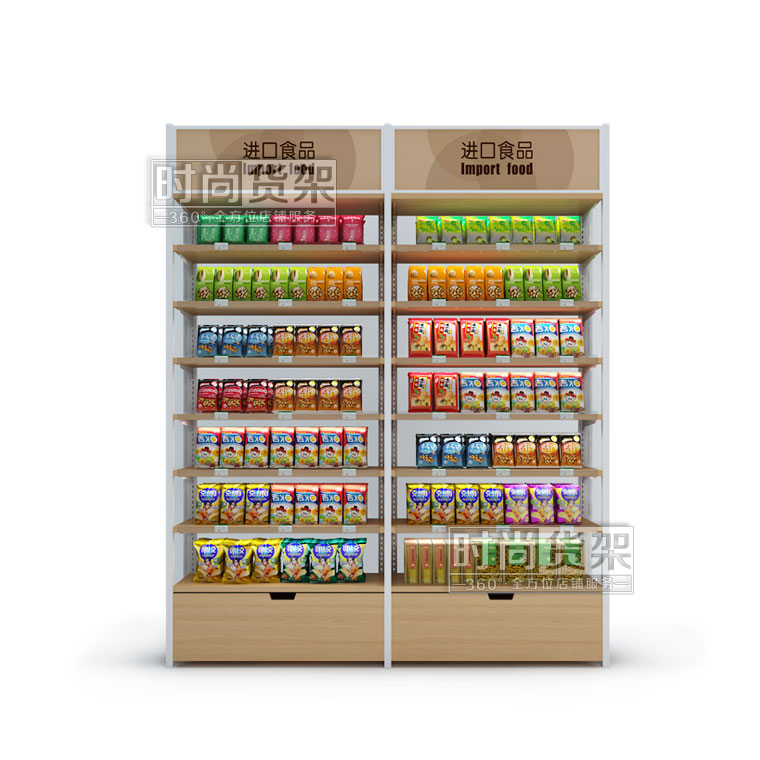 【特點】透光性強的輕便陽光背板、環(huán)保高檔的木質(zhì)層板,打造出了這款精制時尚的高檔食品貨架。頂部廣告牌的設(shè)計很好地對商品進行分類指示,引導顧客更好地購物,底部的地柜設(shè)計也十分巧妙,增加了貨架整體的儲物功能,將便利店空間更合理地利用了起來。