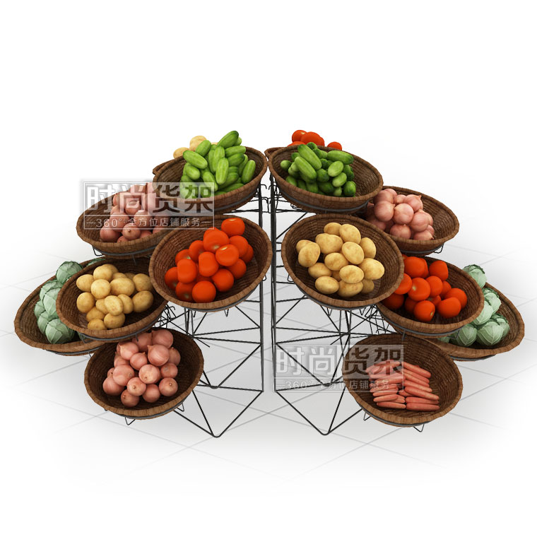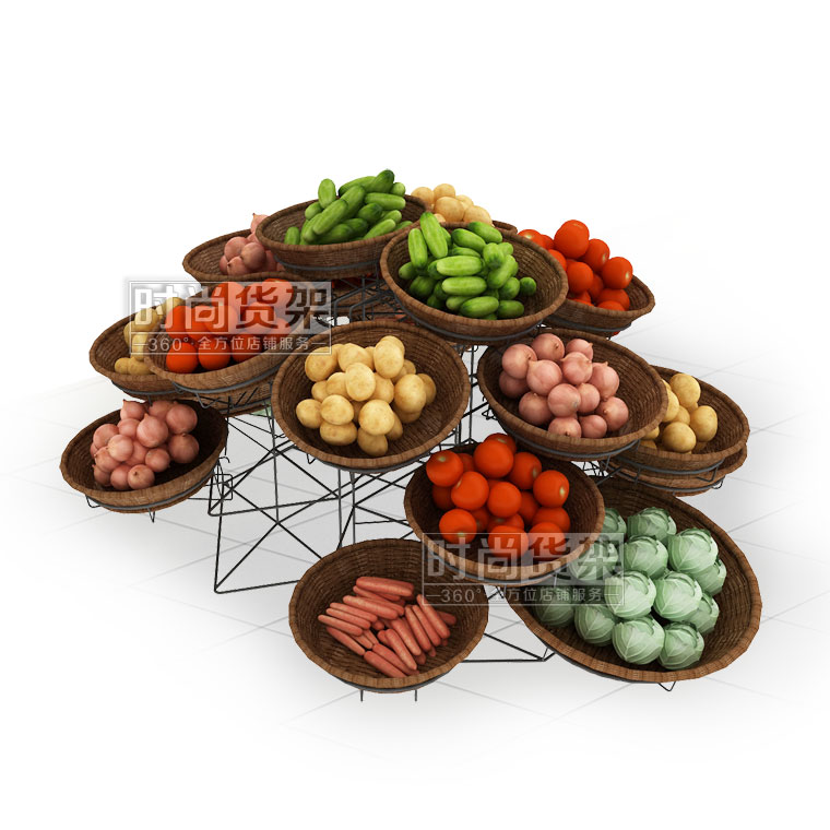 【描述】此款蔬果促銷堆頭設計搶眼,灰色的加粗鋼架,配以咖啡色藤框,高檔精致;優質鋼材,精湛的工藝,讓貨架結構穩定,承重力有保障;蔬果促銷架被設計成上下層次錯落的形式,讓每個藤框中的商品不被遮擋,多面陳列的方式,讓商品展示更充分,放置于店鋪中央,更易于激發消費者的購買欲望