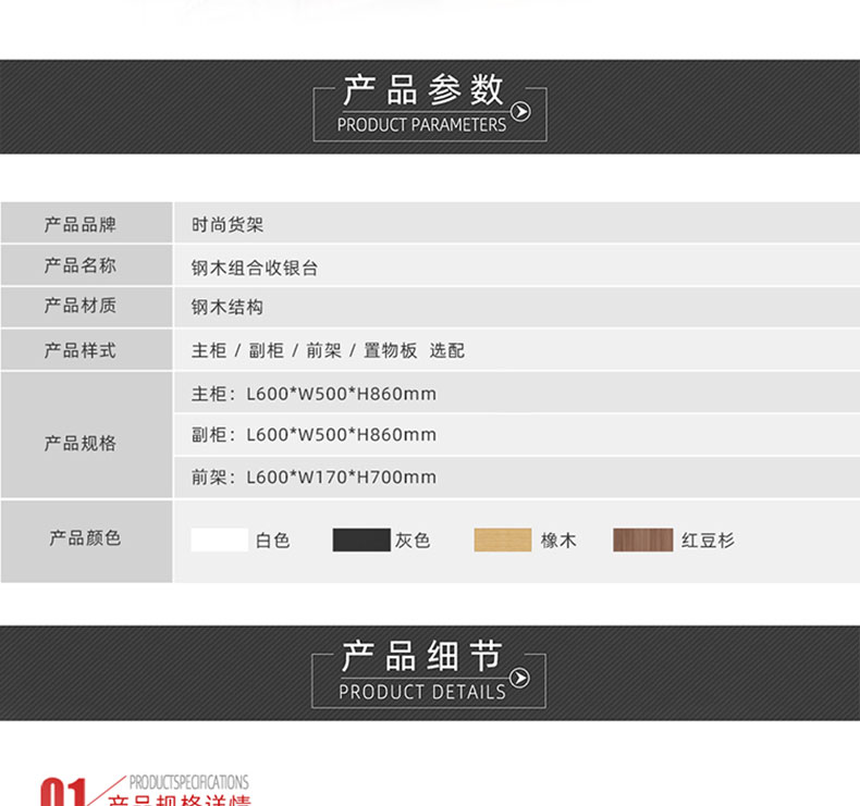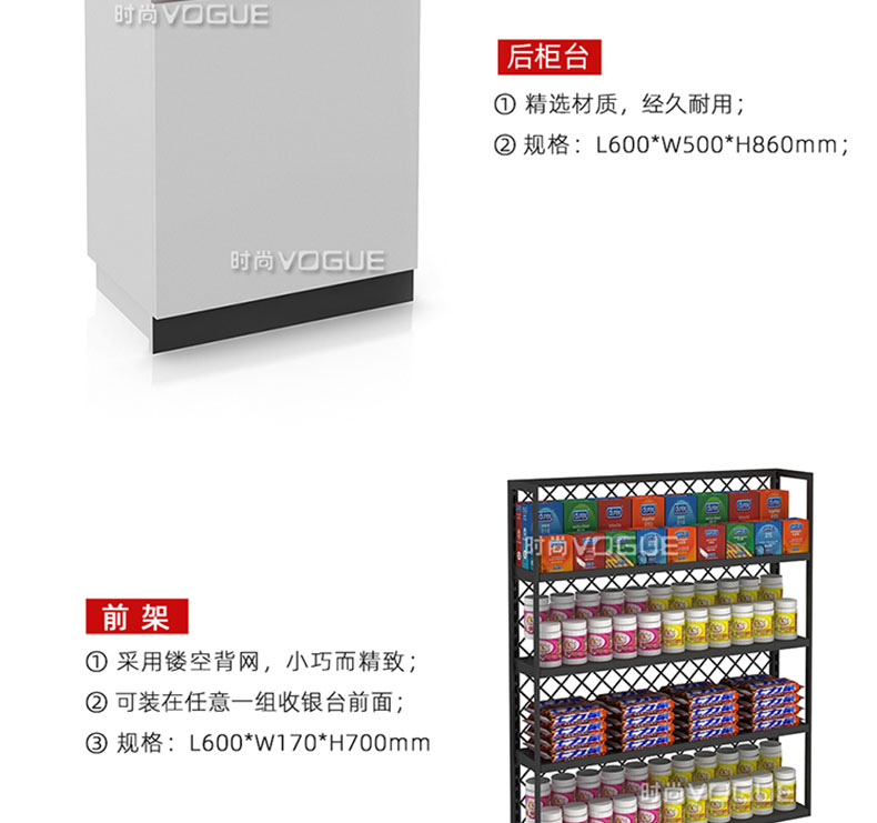 【樣式】主柜+轉角柜+側柜+后柜,可配置小前架、置物板、收銀抽屜