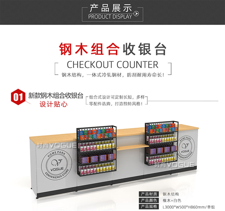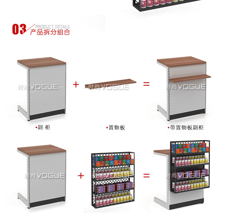 【特點】組合形式,滿足不同收銀區需求;精選材質使用壽命長;擴展側面空間增強收銀臺功能