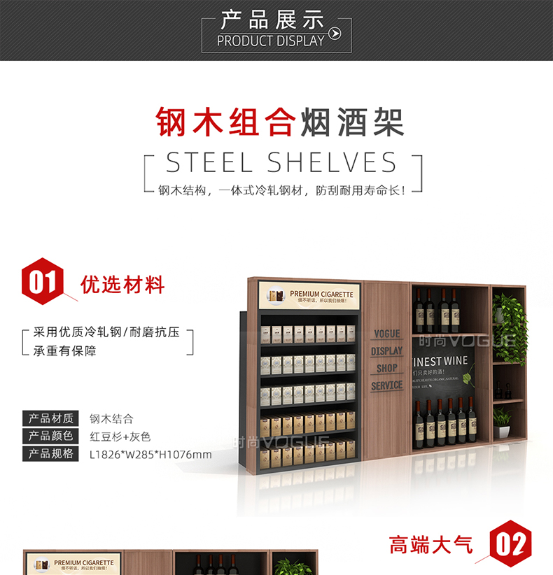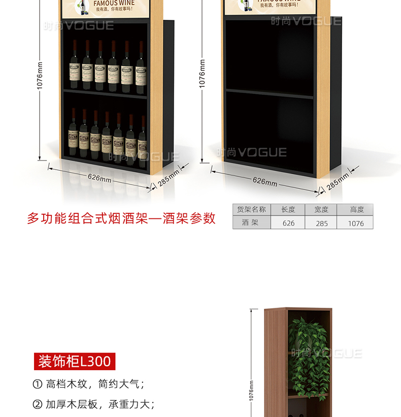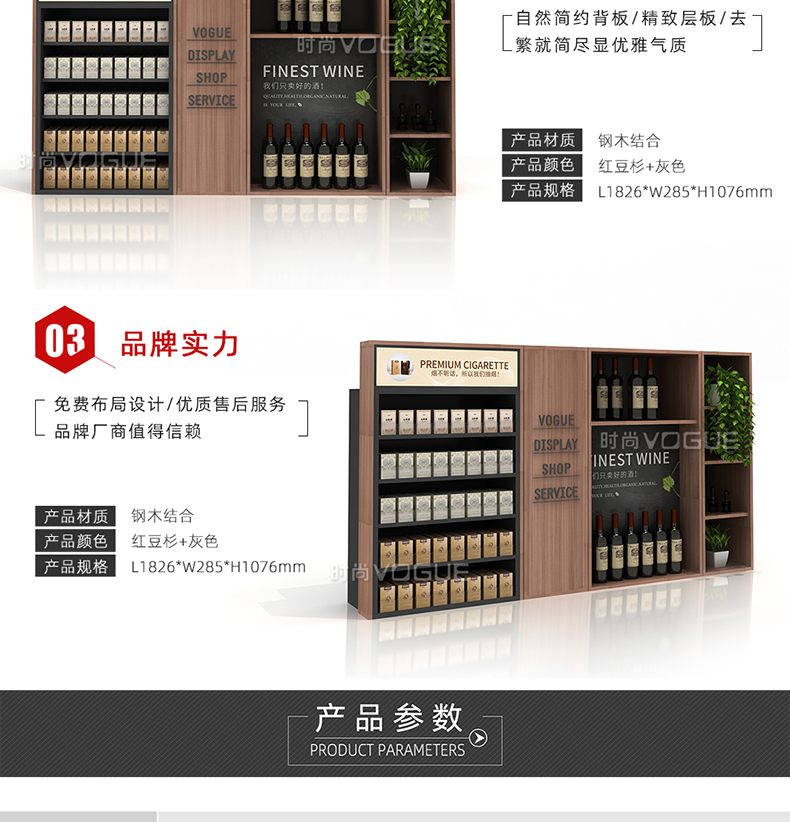 收銀臺紅酒架組合而成。便利店煙酒架立柱采用優質鋼材,具有很好的承重能力。頂部配有磁吸燈箱廣告牌,即可宣傳品牌,又可以指引顧客,讓整個收銀區的工作效率顯著提高。此款收銀區煙酒架是框架式結構,可以直接放置在收銀背柜上,穩定性和安全性很好。