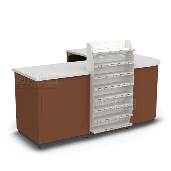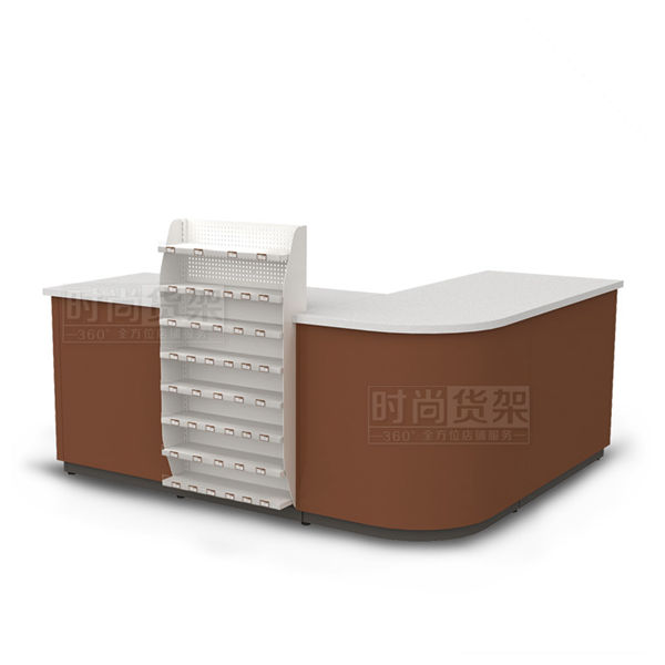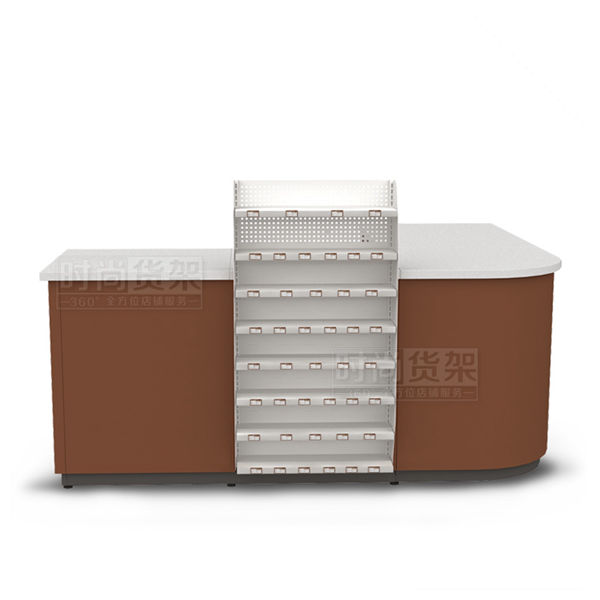 【描述】此款便利店收銀臺是時尚貨架2017年新推出的一款組合式收銀柜臺,采用弧形轉角設計,有白色、灰色、咖啡色三種顏色可以選擇。收銀臺采用優質三胺板,堅固耐用。整體造型簡潔實用,還可根據需求配置多個小前架,方便收銀區放置更多小商品。是一款高性價比的便利店收銀臺。